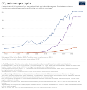 Here I want to reflect and offer some additional information and insights. The first thing to remember is that the important point is to identify general patterns. It is easy to get hung up in debates over precise numbers, which can be all over the place. Nonetheless, I want to add some more details, if only to explain how I got to various estimates. When I was doing my research, I was interested in the transition to fossil fuels; this includes both industry as well as, for example, burning coal to heat homes. (For one article that discusses estimates, see Robbie M. Andrew, “A Comparison of estimates of global carbon dioxide emissions from fossil carbon sources,” in Earth Systems Science Data, 12, 2 (2020): 1437-65.) There is also another article that may be of help: Pierre Friedlingstein et al, “Global Carbon Budget,” also published in Earth Systems Science Data, 17, 3, 14 March 2025. You will note that there a wee little bit of slippage; the authors reference 1750 but mostly use 1850 as the baseline for the “historical period.”